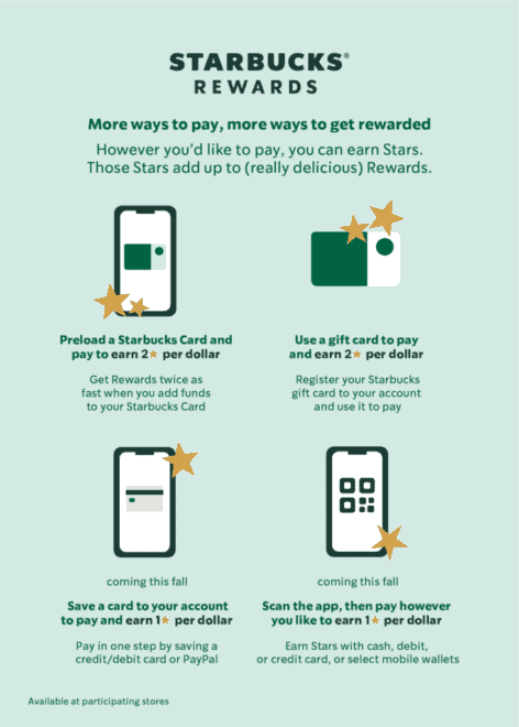 En 2020, le nombre de membres actifs du programme de fidélité Starbucks Rewards essentiellement sur l’app pendant 90 jours aux États-Unis est passé à 21,8 millions, en hausse de 15 % d’une année sur l’autre. Depuis l’automne 2020, dans les magasins gérés par l’entreprise aux États-Unis et au Canada, les membres Starbucks Rewards peuvent également scanner leur application, puis payer en espèces, par carte de crédit/débit ou sélectionner des portefeuilles mobiles et gagner des étoiles contre des articles gratuits.