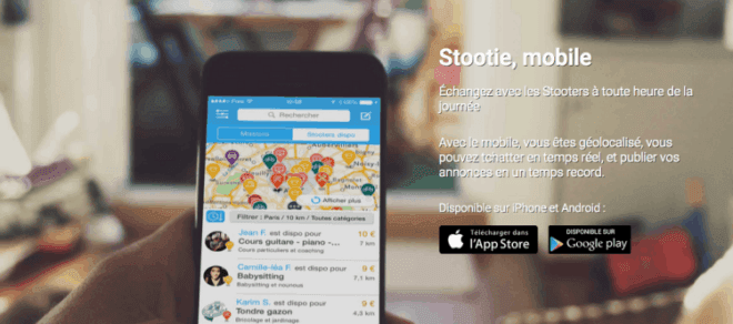 Avec une communauté de 170 000 membres (50 000 utilisateurs actifs,12 000 000 € de volume d’affaires) Stootie est le leader français des applications collaboratives de services : demander de l’aide pour un déménagement, trouver une baby-sitter dans son quartier ou faire réparer son ordinateur… c’est simple et efficace. Stootie met en relation les utilisateurs à proximité et leur permet de se rendre service, gratuitement ou contre rémunération. L’application permet également de vendre, troquer, donner des objets d’occasion ou des produits locaux.