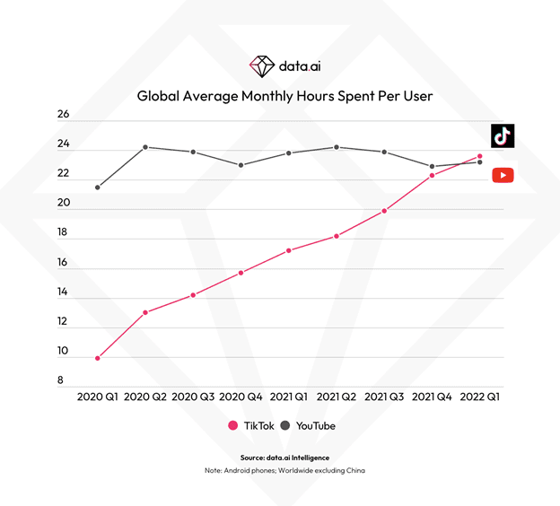 TikTok a dépassé YouTube, le champion en titre en termes de temps passé par utilisateur, au premier trimestre 2022 dans le monde (hors Chine). Le temps moyen mensuel par utilisateur de TikTok a atteint 23,6 heures par mois, contre 23,2 heures pour YouTube. Le temps passé par utilisateur a augmenté de manière significative pour TikTok, de 40 % par an et de 140 % par rapport au premier trimestre 2020. TikTok a également dépassé Facebook de 22 %, ce dernier atteignant 19,4 heures en moyenne par personne au premier trimestre 2022. TikTok et Facebook avaient vu le même temps moyen passé par utilisateur en 2021 à 19,6 heures mensuelles par utilisateur. TikTok s’est classé au cinquième rang mondial des applications de médias sociaux pour le temps total passé sur les téléphones Android au premier trimestre 2022.