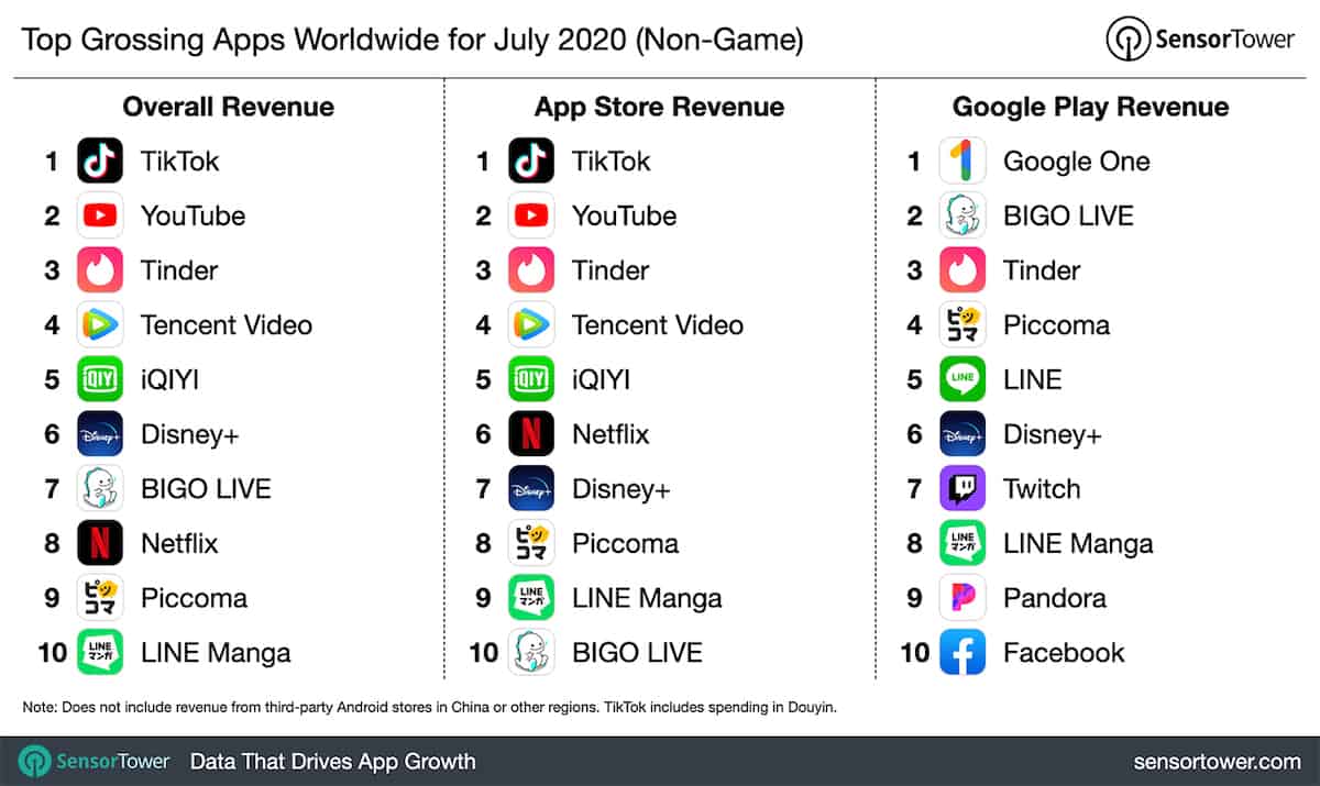 L’application la plus rentable dans le monde en juillet 2020 était TikTok avec plus de 102,5 millions de dollars de dépenses d’utilisateurs, 8,6 fois ses revenus de juillet 2019. Environ 89% des revenus de TikTok provenaient de la Chine, suivis de 6% des États-Unis. Depuis son lancement il y a deux ans, l’application de partage de vidéos courtes TikTok a dépassé les deux milliards de téléchargements et continue à jouir d’une immense popularité. Malheureusement, ces derniers mois, l’application a fait la une des actualités en raison de préoccupations liées à la confidentialité des données.