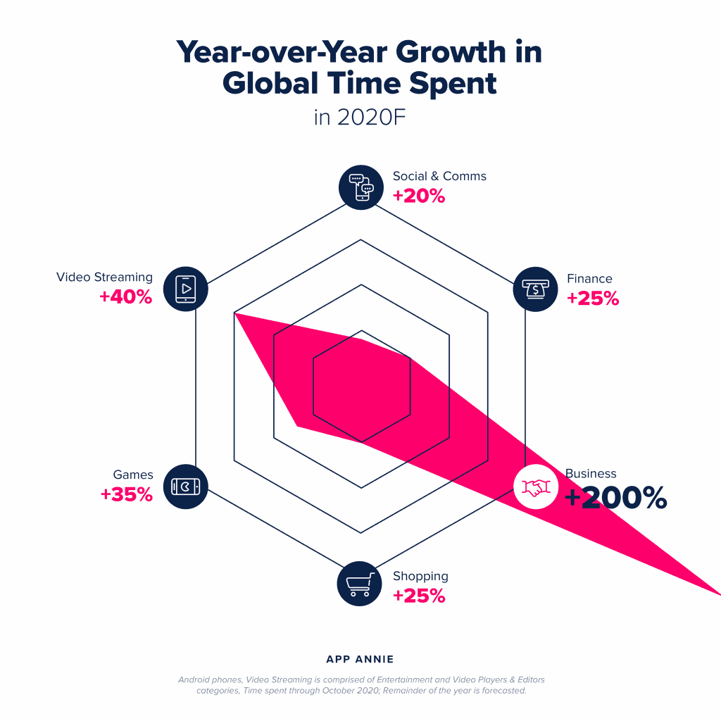 • À l’échelle mondiale, les plus grandes catégories de croissance du temps passé comprennent les applications professionnelles, en hausse de 200 %.