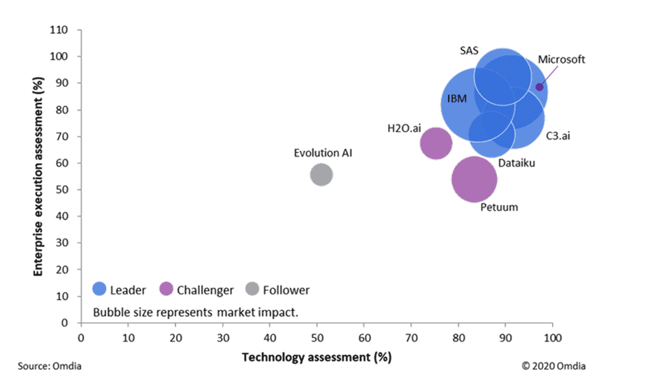 IBM, Microsoft, C3.ai, Dataiku et SAS dominent le marché. 5 leaders qui sont les fournisseurs de plates-formes de développement d'intelligence artificielle (IA) et d'apprentissage automatique.