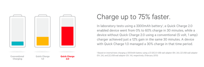 Quick Charge 3.0 permet de recharger un téléphone de 0 à 80% en 35 minutes environ, au lieu d’1h30 en moyenne pour un appareil mobile n’étant pas équipé de Quick Charge.