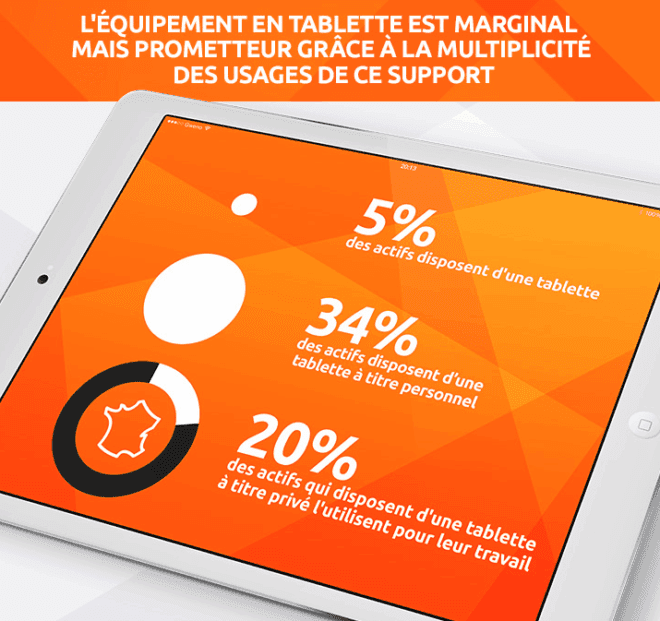 L’équipement en tablette pro reste assez marginal puisque seulement 5% des interviewés affirment disposer d’une tablette « pro ». Toutefois, si l’on considère les actifs utilisant leur tablette privé à titre professionnel, la proportion augmente à 20% d’utilisateurs. Ce sont majoritairement des hommes occupant des postes d’encadrement et à responsabilité en contact régulier avec leurs clients et à forte mobilité.Les usages quant à eux sont beaucoup plus variés puisque la navigation sur le web et la consultation de ses mails pro constituent les deux usages les plus courants. S’en suivent la consultation de la presse, le travail sur des logiciels de présentation et les appels avec ou sans visio.