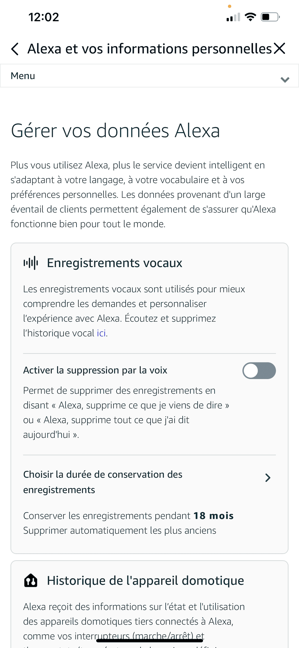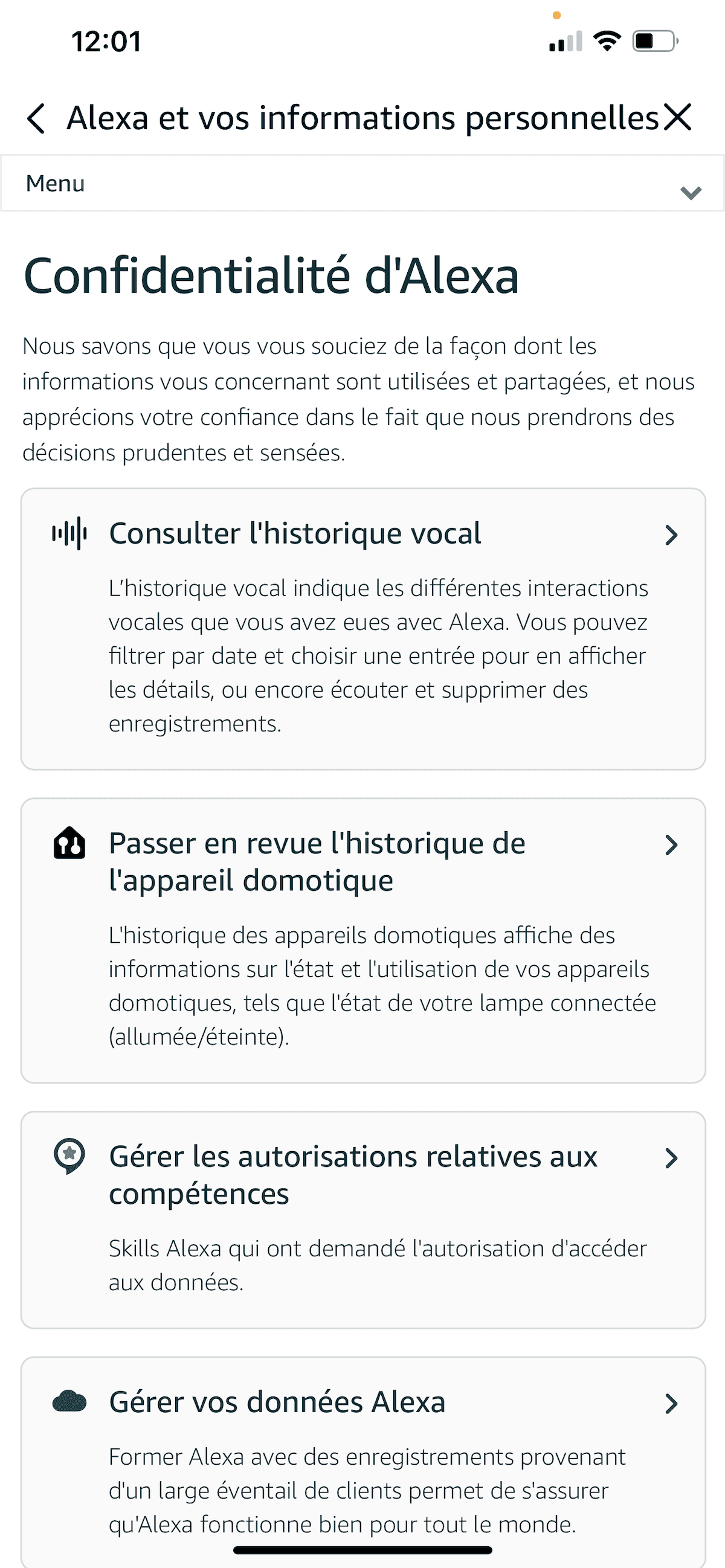 - Apparait Confidentialité Alexa qui permet de consulter l’historique vocal, passer en revue l’historique de l’appareil, gérer les autorisations relatives aux compétences et gérer vos données Alexa.