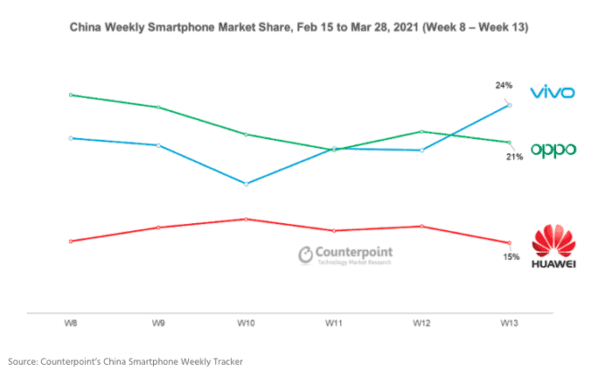 La bataille pour la suprématie sur le marché chinois des smartphones s’intensifie, la première place changeant rapidement de mains. Sur la base de la solide performance continue de ses modèles budgétaires nouvellement lancés Y3 et S9, Vivo a pu devancer OPPO au cours de la semaine 11 et à nouveau au cours de la semaine 13 de cette année. Vivo a été l’une des premières marques du marché à lancer des appareils 5G, avec le Nex 3 5G et l’iQOO Pro 5G en août 2019 et septembre 2019, respectivement. Vivo a rapidement développé son portefeuille 5G pour représenter plus de 76 % de ses ventes en février 2021, contre seulement 0,5 % en août 2019.