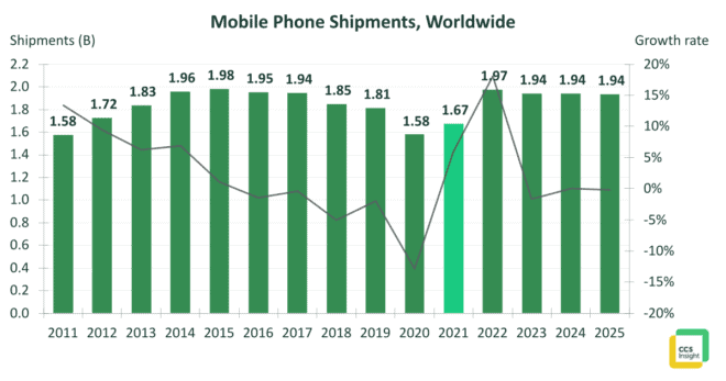Les ventes de téléphones mobiles ne reviendront pas aux niveaux d’avant la pandémie avant 2022, mais une demande refoulée, une reprise macroéconomique plus large et une plus grande disponibilité des réseaux et des téléphones 5G devraient toutes stimuler la reprise sur le marché. CCS Insight prévoit que les ventes de téléphones mobiles atteindront 1,67 milliard cette année, une augmentation de 6 % en glissement annuel mais toujours de 8 % de moins qu’en 2019. Cependant, les perspectives sont meilleures pour 2022, au cours desquelles 1,97 milliard d’unités devraient être décalées.