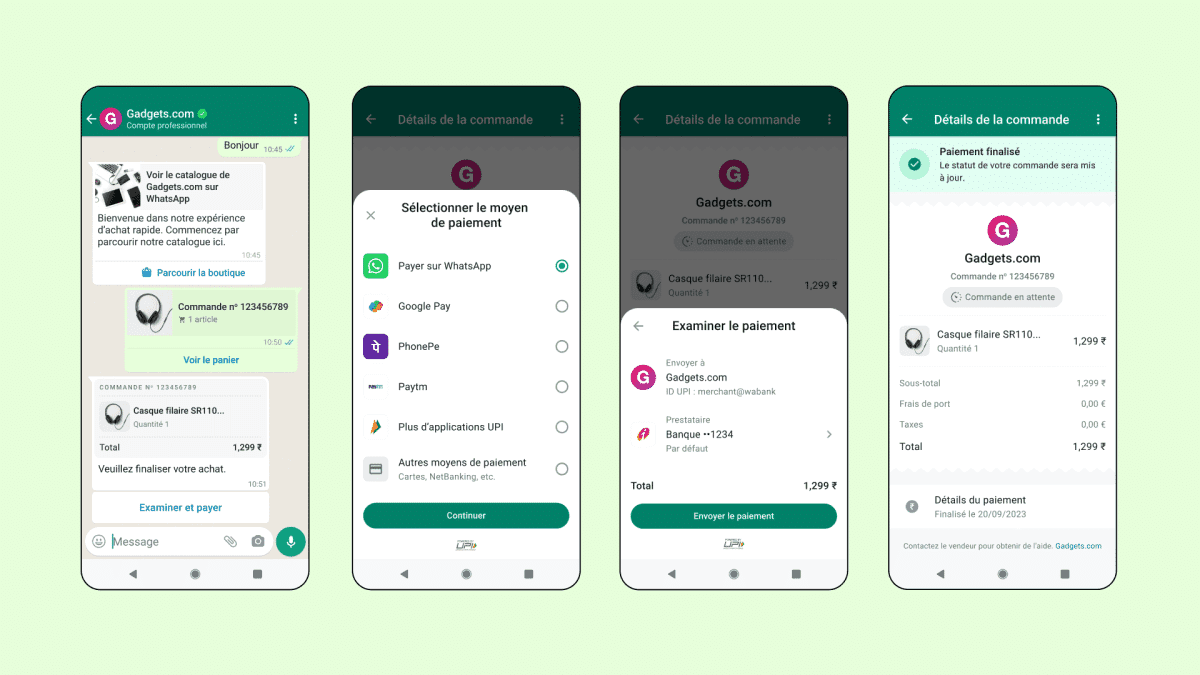 Le service va faciliter les achats dans la discussion. À partir d’aujourd’hui, les personnes qui utilisent WhatsApp en Inde (terrain de jeu de WA) pourront ajouter des articles à leur panier et effectuer un paiement en utilisant la méthode de leur choix : interface de paiement unifiée, carte de crédit ou de débit, etc. Grâce à nos partenaires Razorpay et PayU, effectuer un paiement sera tout aussi facile qu’envoyer un message.