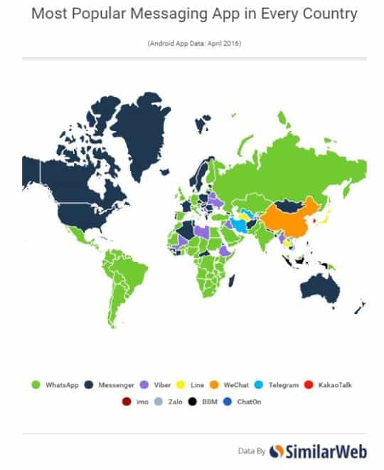 WhatsApp a été n ° 1 dans 109 pays, en fonction du pourcentage des installations et de l’utilisation quotidienne, avec ces pays dont le Brésil, l’Inde, le Mexique, le R.U., la Russie et d’autres pays d’Amérique du Sud, en Europe, en Afrique et en Asie. Messenger est arrivé deuxième, dépassant 49 pays, dont l’Australie, le Canada et les États-Unis.