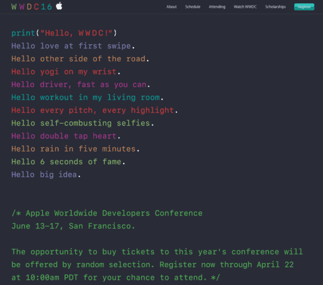 Avec quatre systèmes d’exploitation innovants et un nouveau langage de programmation pour plus de 1 milliard d’appareils dans le monde entier,la WWDC 2016 va être un événement marquant pour les développeurs qui code en Swift. Les développeurs peuvent demander des billets via le site WWDC . Les billets seront émis aux participants par le biais d’un processus de sélection aléatoire (1559$), et les développeurs seront informés sur l’état de leur demande d’ici le lundi, Avril 25. Pour la deuxième année consécutive, il y aura jusqu’à 350 bourses WWDC disponible, donnant aux étudiants à travers le monde la possibilité de gagner un billet pour rencontrer et collaborer avec certains des développeurs les plus talentueux de l’écosystème d’Apple.